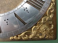 Das vollständige und gut erhaltene Tages-Uhrwerk mit Spindelhemmung und einem Federhaus für Lauf- und Schlagwerk (mit "Storchenschnabel"-Auslösung) hat ein vergoldetes Messingzifferblatt, getriebene vergoldete Eckappliken, einen versilberten Ziffernring mit ausgeschnittenen römischen Zahlenkranz und darunter befindlichem geschwärztem Hintergrund sowie äußerer arabischer Fünfminutenteilung, Messingzeiger und eine Bronze-Glocke auf dem Gehäusekasten, unter einer abnehmbaren Haube.