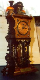 Herren hatte, nur bestätigt. Bevor ich das Werk einbaute, testete ich den Schaukelmechanismus im Werkhalter. Mein großer Werkhalter passte leider überhaupt nicht, aber ein Modellbauschraubstock mit Kugelgelenkhalter leistete hier hervorragende Dienste. Ein wenig langwierig gestaltete sich dann die Einstellung des Ankers, da die Uhr auf Grund der Pendelkonstruktion mit Umlenkung wirklich absolut senkrecht stehen muss, um einen gleichmäßigen Abfall zu haben. Diese Einstellung gelang mir dann nach geraumer Weile. Nun wurde es Zeit, das Werk in sein angestammtes Gehäuse einzusetzen. Dies gelang ohne weiteres bis auf ein letztes kleines Problem: Der Uhrmacher, welcher das Quarzwerk eingebaut hatte, musste das Zifferblatt ein wenig versetzen damit das Werk richtig passte. Natürlich musste ich nun auch diese Korrektur wieder rückgängig machen, was mir abermals eine Freude war. Dabei bemerkte ich das letzte der zahlreichen Vergehen: Der Abschlussreif für das Zifferblatt, welcher aus Messing gefertigt ist, wurde nur auf der rechten Seite durch eine Messingschraube gehalten. Die linke Befestigung bestand aus einem zur Hälfte gekürzten Stahlnagel ... Dass auch dieses Manko beseitigt wurde, versteht sich von selbst. Als nun das Uhrwerk wieder in seinem Gehäuse saß, das Pendel schaukelte und die Uhr lief, da waren alle Anstrengungen und Probleme vergessen. Große Freude ...