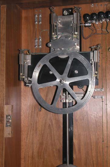 SignalsystemeWir verlassen jetzt die Grundfunktion der Uhr – Anzeige der Zeit auf visuellem Weg – und untersuchen die akustische Signalisierung der Zeit, hauptsächlich in Fabriken und Schulen. Das kann gewöhnlich erreicht werden dank eines zusätzlichen Kontaktmoduls, das in eine Uhr - gleich welcher Art – eingebaut wird. Meistens besteht es aus einer oder mehreren Scheiben, die eine Umdrehung in 24 Stunden ausführen. Sie haben Bohrungen für kleine Stifte in Intervallen von 1 oder 5 Minuten. Diese Stifte schließen zum gewünschten Zeitpunkt einen Kontakt, z.B. zum Betrieb einer Glocke. Das System kann durch ein Wochenprogramm oder eine Anpassung der Signaldauer erweitert werden. (Abb. 27 und 28).