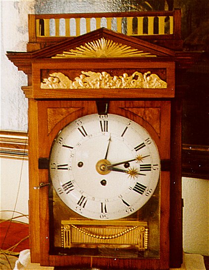 Weiterentwicklung und zum Bau dieser Uhren inspirieren ließen. (16) Trotz der Herstellung dieser wahrlichen Meisterwerke dürfte die Produktion einfacher Uhren für den heimischen Markt fortgeführt worden sein. Wir sind nicht unbedingt der Meinung wie Fabian, dass alle diese einfachen Uhren vor 1770 zu datieren sind. Es ist eher der Fall, dass manche dieser Uhren über 1780 hinaus für den heimischen Markt, das Bürgertum, gebaut wurden. Nachdem Roentgen seine Werkstatt gegen 1795 auflöste und sich auf Reisen begab, um seine letzten Möbelstücke zu verkaufen, führte Kinzing seine eigene Werkstatt weiter. Diese wurde später dann von seinen Söhnen Christian und Carl weitergeführt. Vom Zeitpunkt der Übernahme durch die Söhne an wurden keine bemerkenswerten Uhren mehr produziert. Es sind aus dieser Zeit eine Standuhr und eine Bilderuhr (17), die als Motiv die Pfalz bei Kaub zeigt, bekannt . (18)